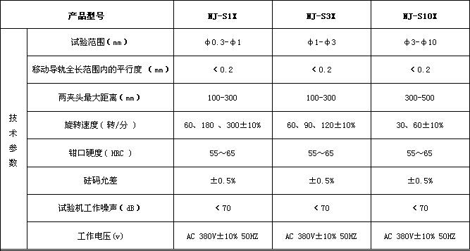 型號:NJ-S1X,NJ-S3X,NJ-S10X一、用途:該扭轉(zhuǎn)試驗機(jī)主要用于測定直徑φ0.3-φ1mm,φ1-φ3mm,φ3-φ10mm金屬線材在單向或雙向扭轉(zhuǎn)中承受塑性變形的能力,試驗過程中可以顯示線材的表面缺陷。主要適用于科研部門、工礦企業(yè)和大專院校的力學(xué)實驗室用來測定材料的扭轉(zhuǎn)性能,特別適合生產(chǎn)線材單位在線檢測及使用線材單位的進(jìn)貨檢驗。二、性能特點:l、扭轉(zhuǎn)試驗機(jī)有2-3種旋轉(zhuǎn)速度可供選擇,如30、60、90、120、180、300轉(zhuǎn)/分,通過皮帶塔輪調(diào)整;2、可夾持線材長度300-100mm、500-300mm;用滑輪導(dǎo)向砝碼加軸向力,液晶顯示試驗圈數(shù),試件斷裂后試驗圈數(shù)值自動鎖存。